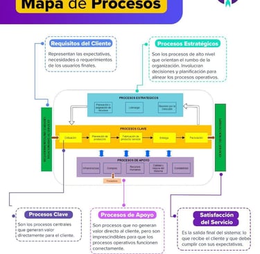 El mapa de procesos nos permite identificar, organizar y comprender cómo funciona una organización a través de sus procesos. Muestra de una manera visual la relación entre las actividades clave y cómo estas contribuyen al cumplimiento de los objetivos estratégicos.
